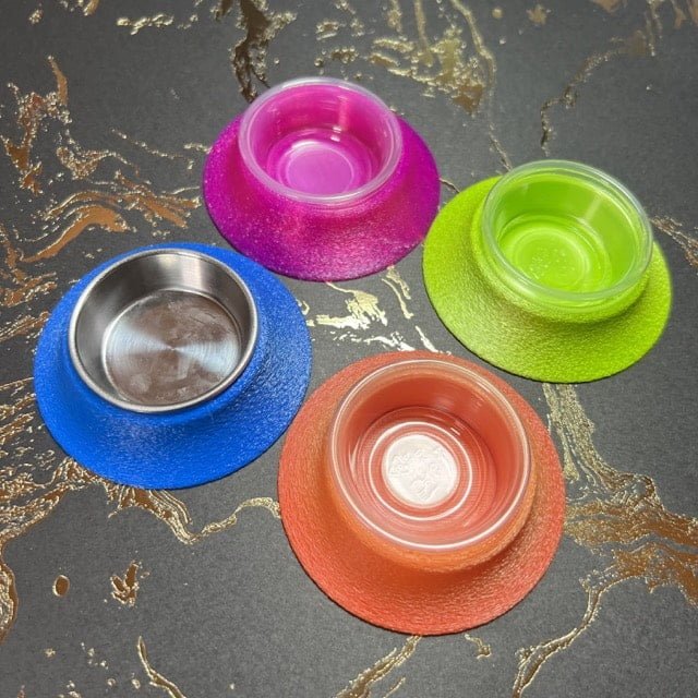 Each cup has a textured ramp that leads up to the bowl. This bowl can include a .5 oz metal bowl if you decide to order one or it can be used with the plastic dishes provided with each purchase. This print is made from PLA filament which is not food-grade. It has not been tested with food going directly into it. We would recommend a bowl placed within the ramp for easy access.