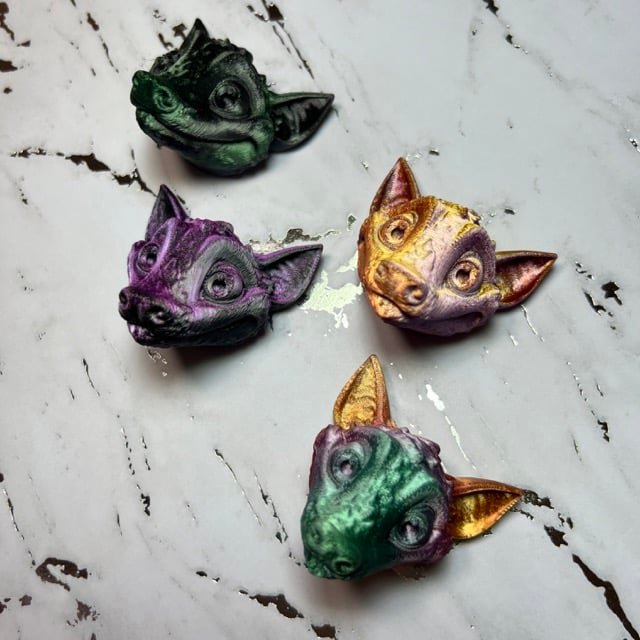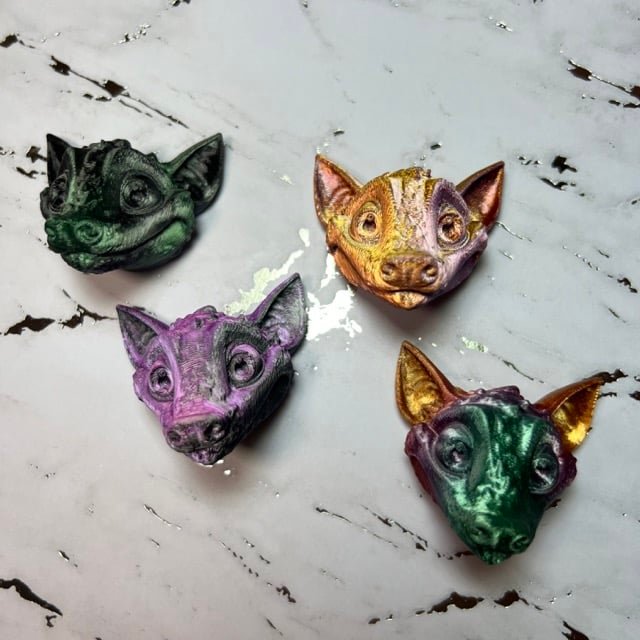 These detailed bat magnets are perfect for your refrigerator or attached to anything metal. These cute little guys come in four different colors. This bat is a smaller, just-the-head, version of our fully articulated bat also available in our shop. If you love bats make sure this one flies into your home!