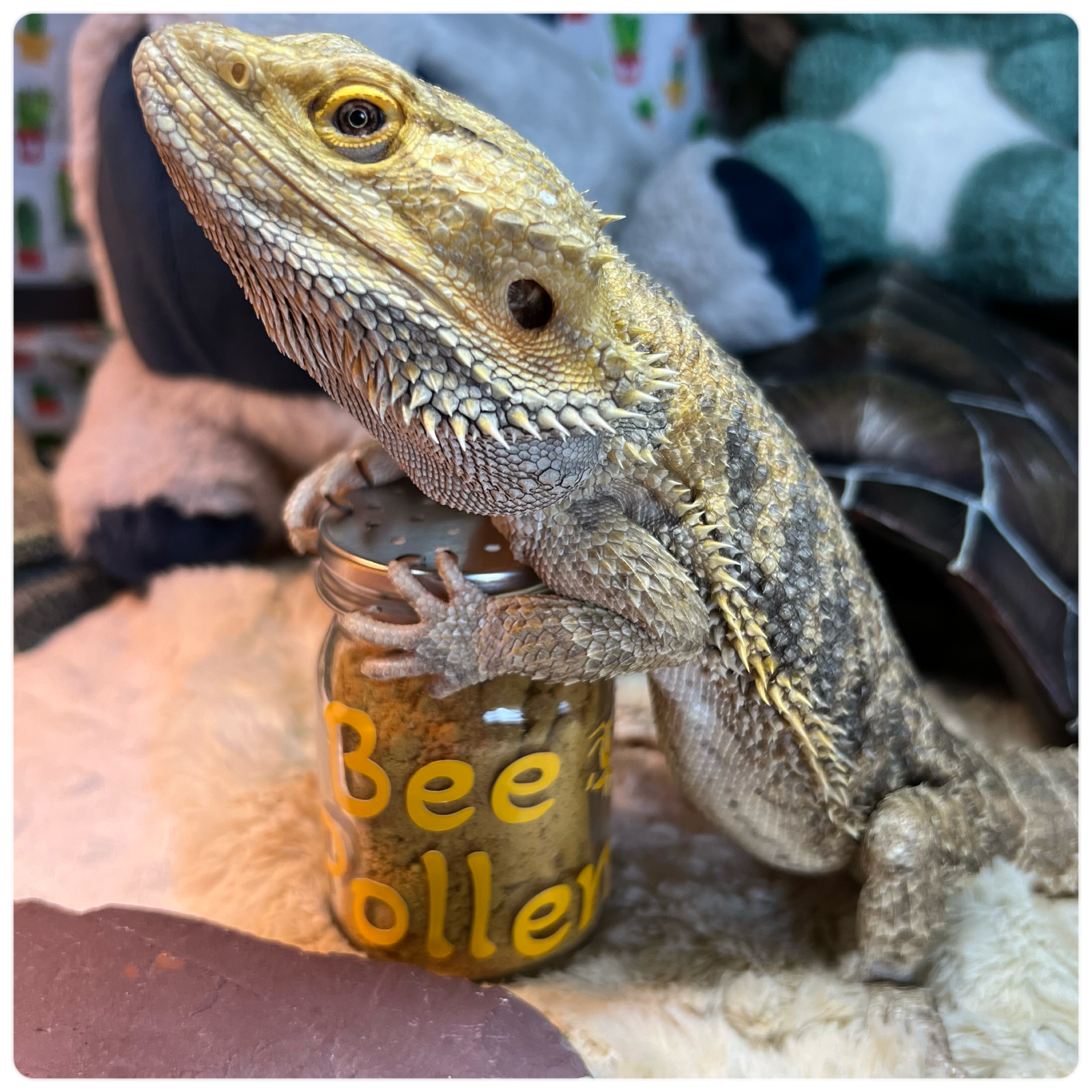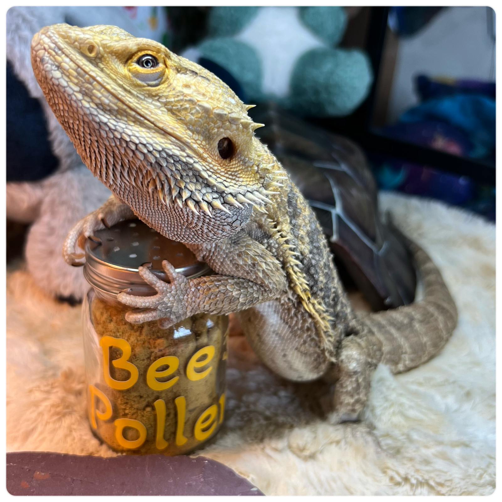 When feeding your bearded dragon do you ever have difficulty with them eating greens? At Lovey Lenny Lizard we found the secret yellow powder… organic bee pollen. Bee Pollen is great to sprinkle something yummy on something yucky and make your dragon believe they want to eat it. Our Lenny Loo gets excited when she sees the jar. It’s not an everyday topping but it’s more of a special treat or when needed. Please read up on organic bee pollen and its benefits here!