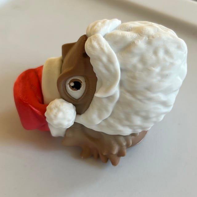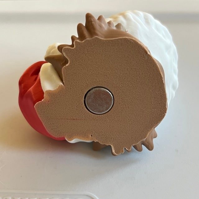 The Beardie is 3D printed in a PLA neutral matte filament and then the hat and beardie are white and red PLA filament to complete the Christmas look. There is a magnet included on the back. There is a separate item available if you would like the larger size as an ornament. No ribbon is included with this item as it is a magnet.