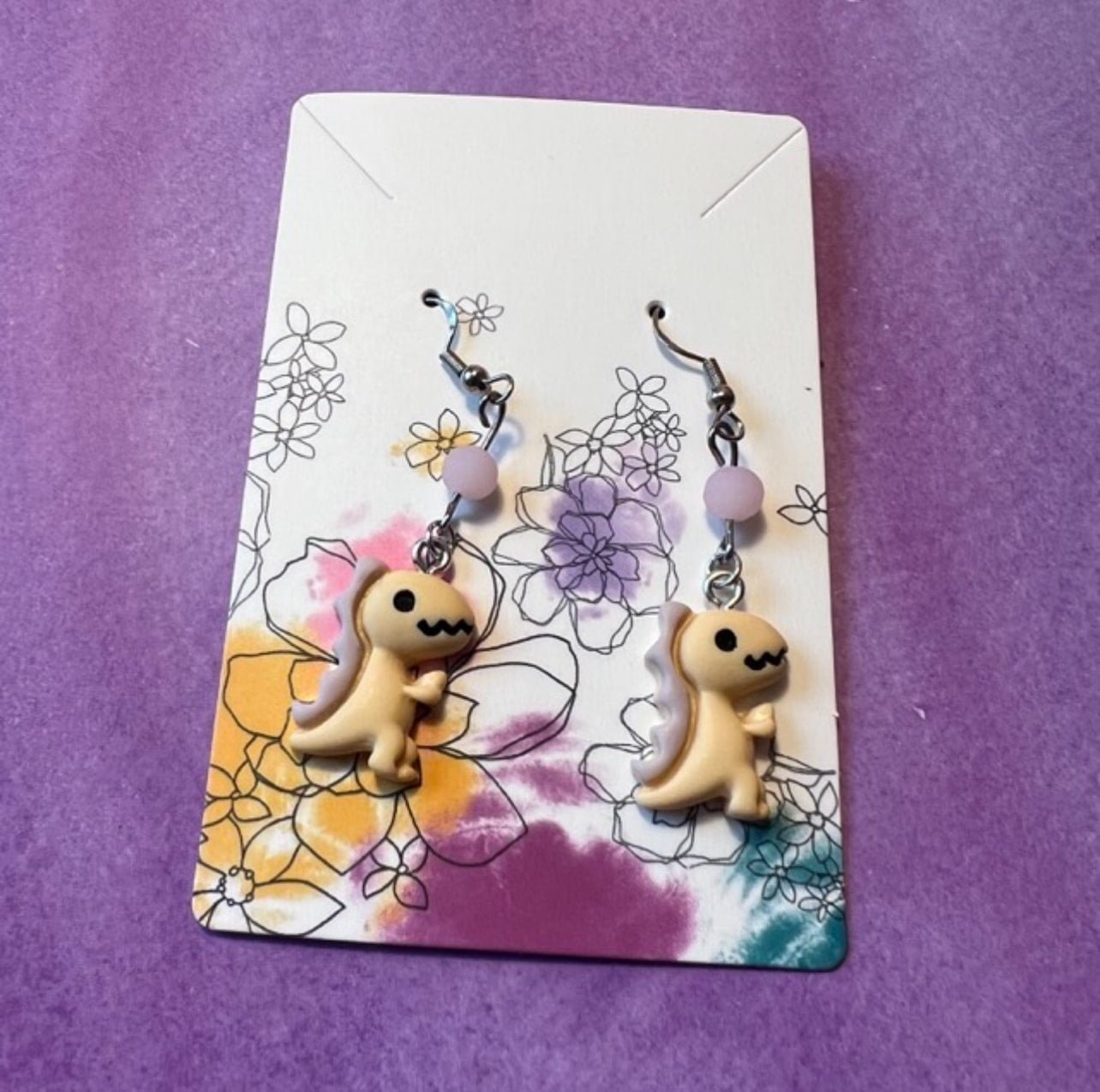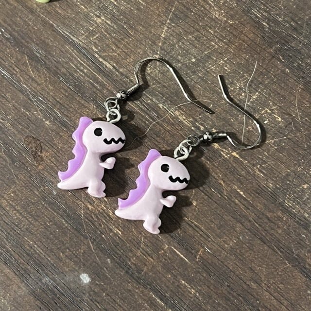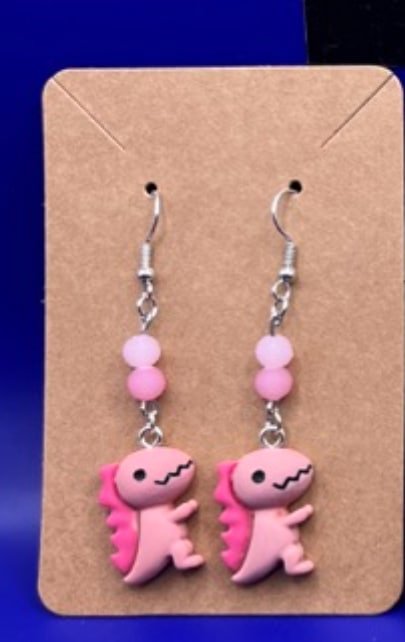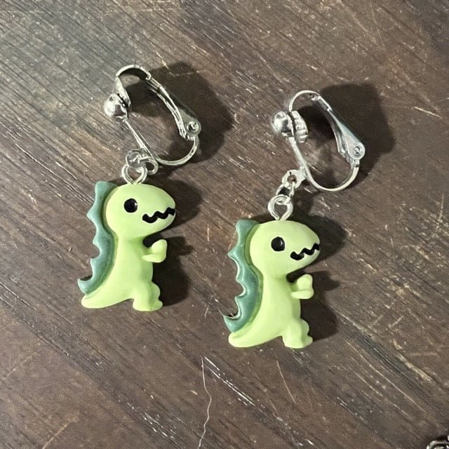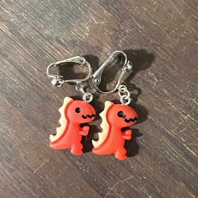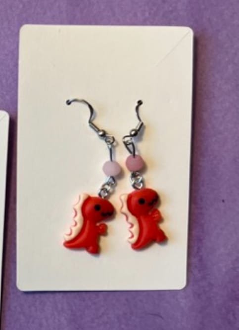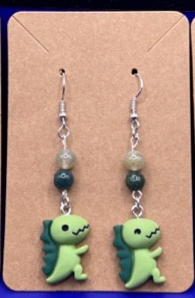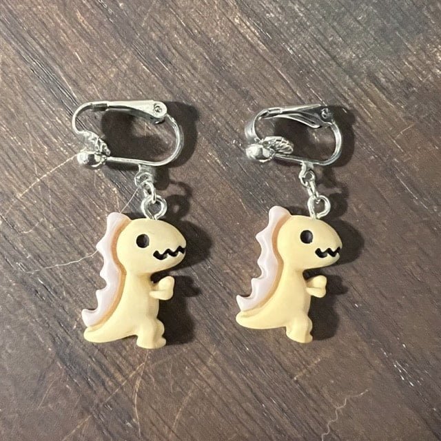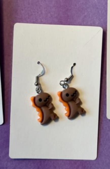 Each earring is made with hypoallergenic metal and comes with a plastic backing for the pierced earrings and a metal clip for the clip-on earrings. These resin dinos are 0.55 inches wide, 0.83 inches high, and 0.24 inches thick. Clip-ons will NOT come with any beads. Some pierced earrings may or may not depending on what is left in stock.