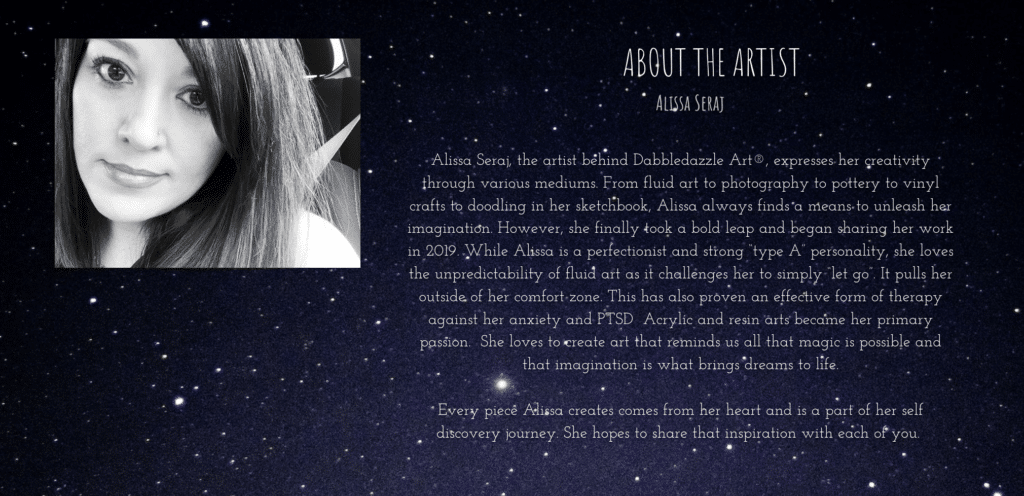 Please join us as we get to know them better. We hope you show your support by liking their posts, following their pages, and shopping for their art! Without further ado let’s get to know Dabbledazzle Art!